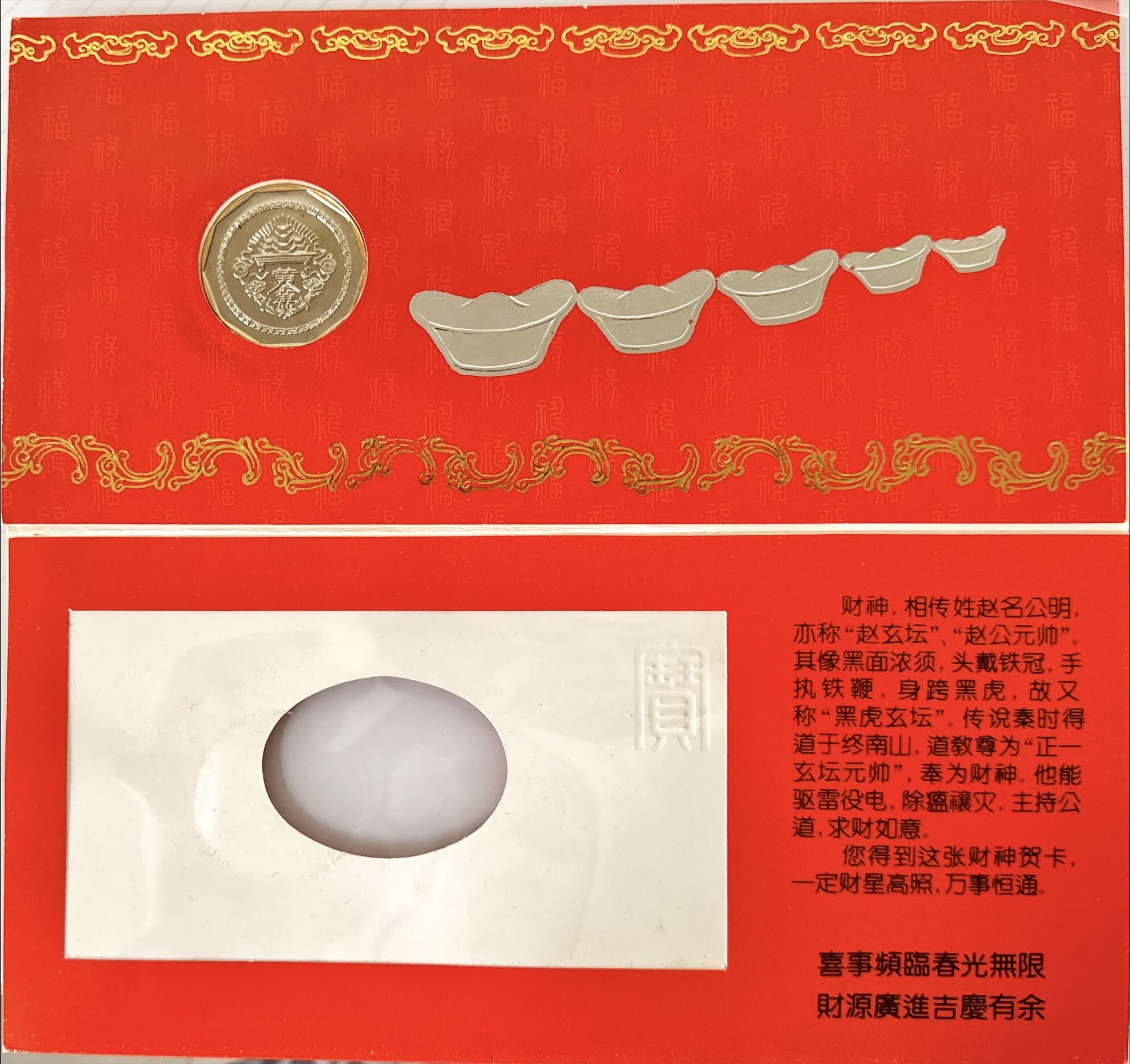 《中国大百科全书·宗教》记载:“俗祀财神赵公明,亦称赵公元帅,精修得道,能驱雷役电,除瘟剪疟,祛病禳灾,买卖求财,使之宜利”。